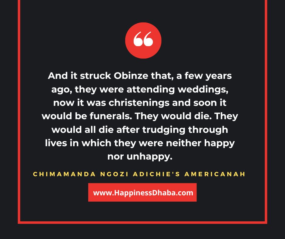 And it struck Obinze that, a few years ago, they were attending weddings, now it was christenings and soon it would be funerals. They would die. They would all die after trudging through lives in which they were neither happy nor unhappy.